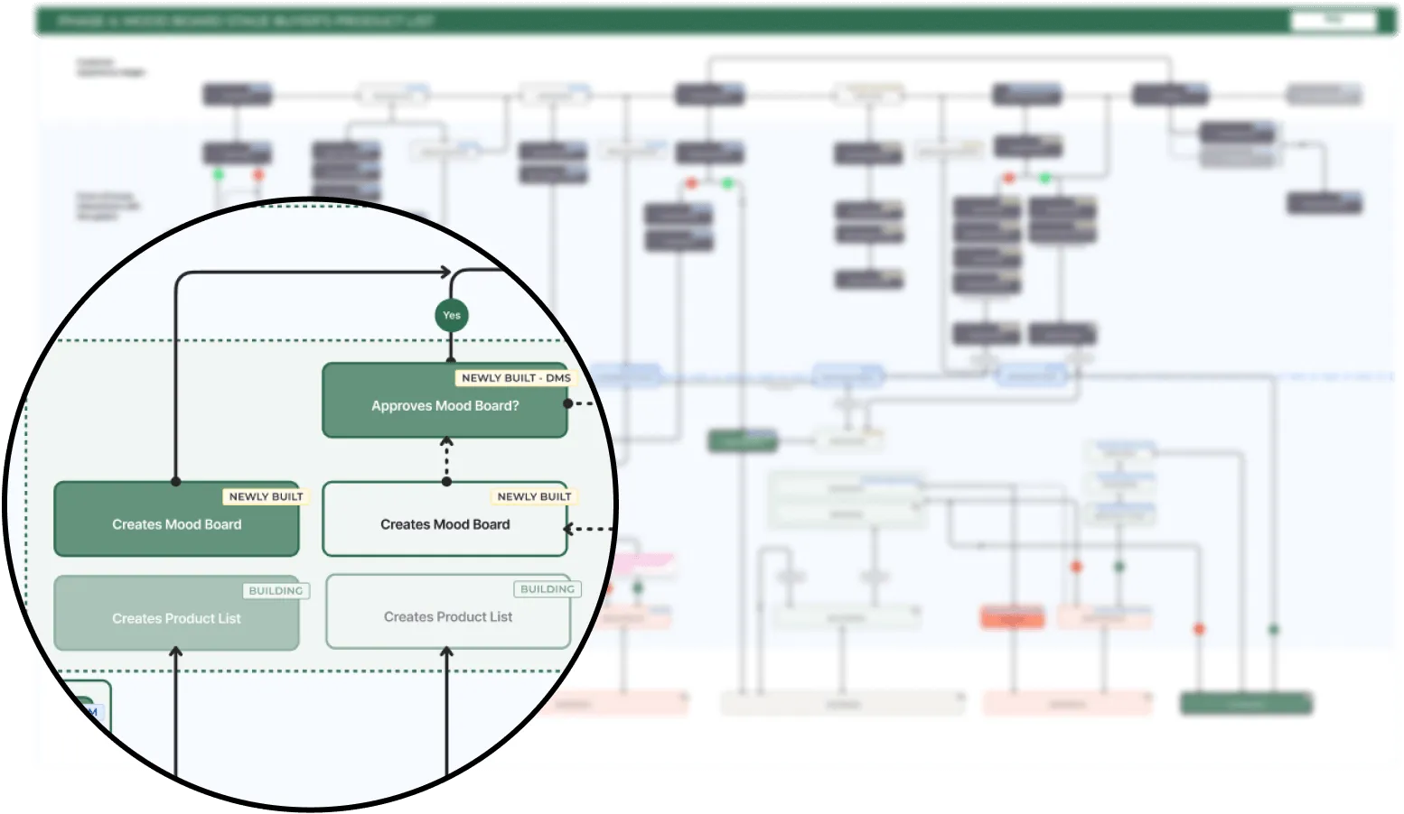 A service blueprint I created with my team mate tracing the end-to-end interior design project cycle, from project intake (starting top left) to order and fulfillment (ending top right). This project is about an internal tool used by designers right after project intake.