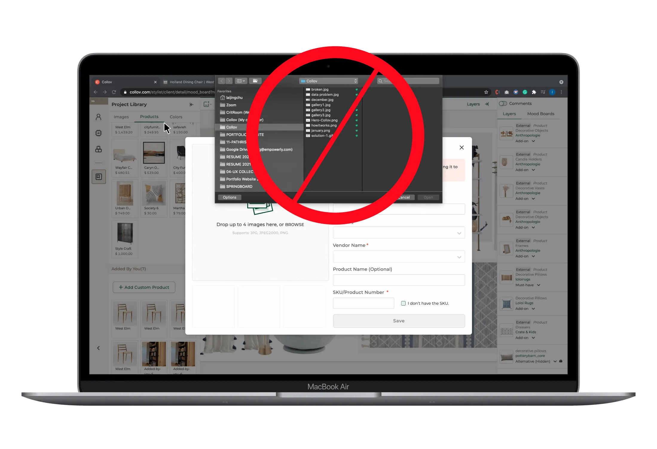 In the first iteration of the product, the only way to uploading an image to the mood board was through opening up the file manager.