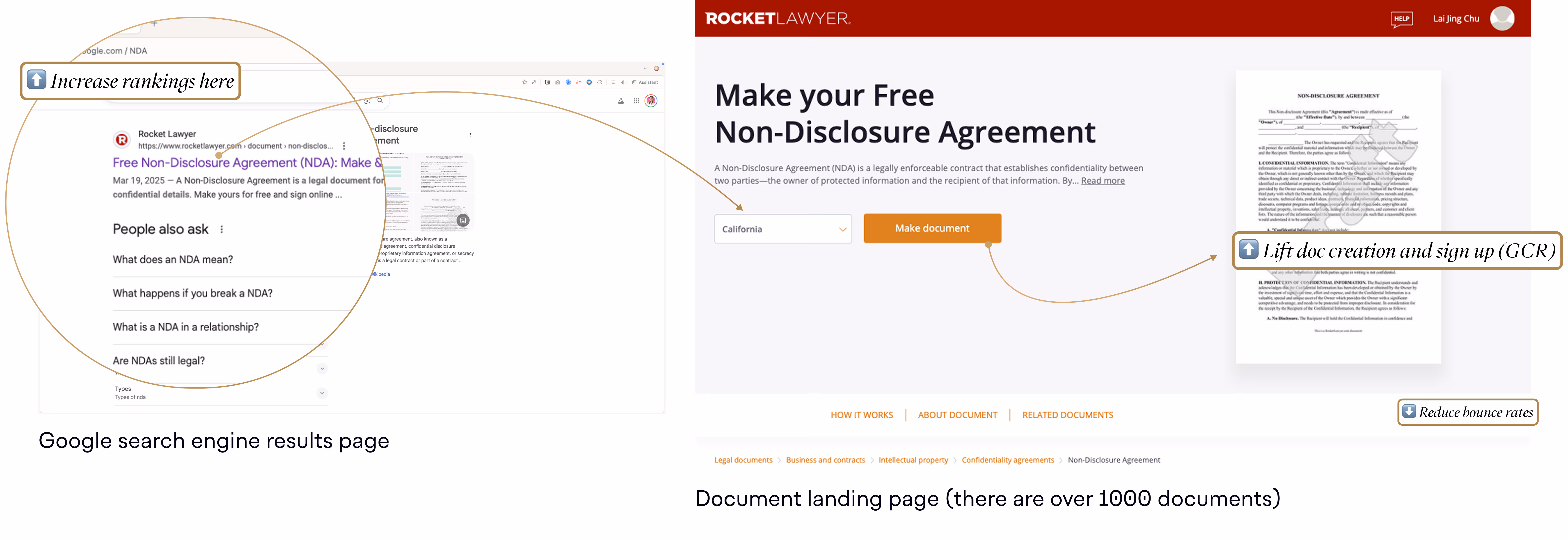 Rocket Lawyer was underperforming competitors in organic search rankings for key document terms. Our goal was to regain our top spot in organic search by shifting the organic strategy.