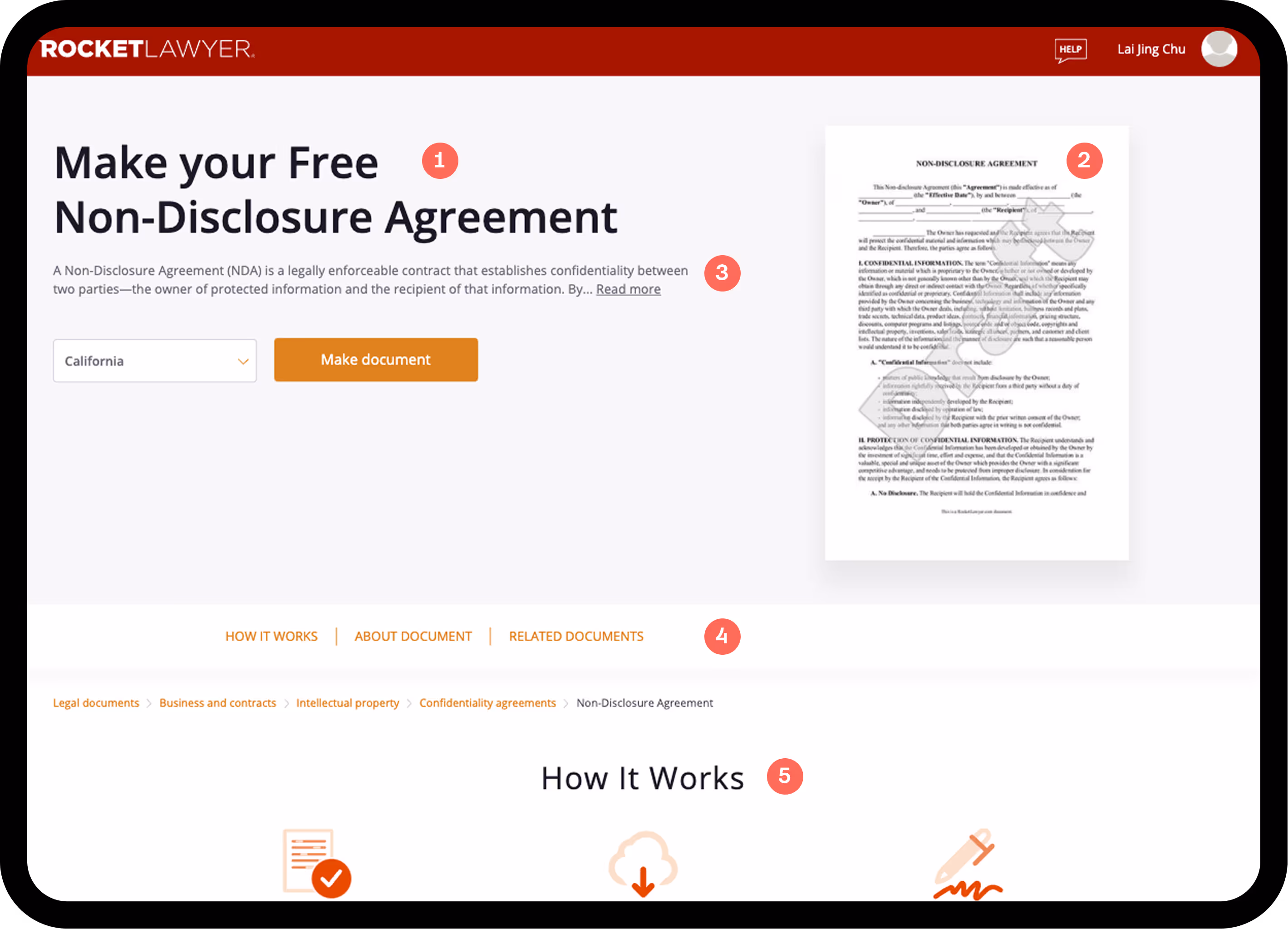 I left Rocket Lawyer shortly before the final design was fully deployed, so I don't have access to the final experiment data. However, the new template launched successfully and remained in production for over 12 months—indicating it met or exceeded our goals of improving SERP rankings, increased visits (goal: +30%), and GCR. A quick Google search confirms that high-traffic document pages like "NDA" now rank at the top above competitors.